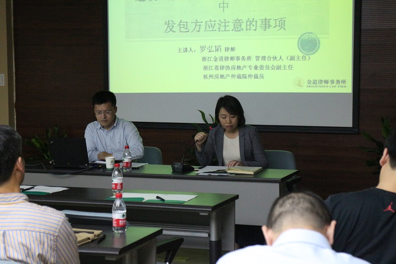 10月21日,为贯彻落实国资监管要求,进一步加强建设工程项目管理,推进科学决策,提高各单位建设工程项目招投标工作质量,保证《浙江省手工业合作社联合社建设工程项目招投标管理暂行办法》的顺利实施,集团公司邀请杭州市建设工程质量安全监督总站陈安东高级工程师和浙江金道律师事务所罗弘韬、陈丽媚律师,分别作了《招投标概述及案例分析》、《招标投标法实施条例解读》和《建设工程施工合同签订和履行过程中发包方应注意的事项》、《建设工程招投标过程中业主的风险及防范》专题讲座。