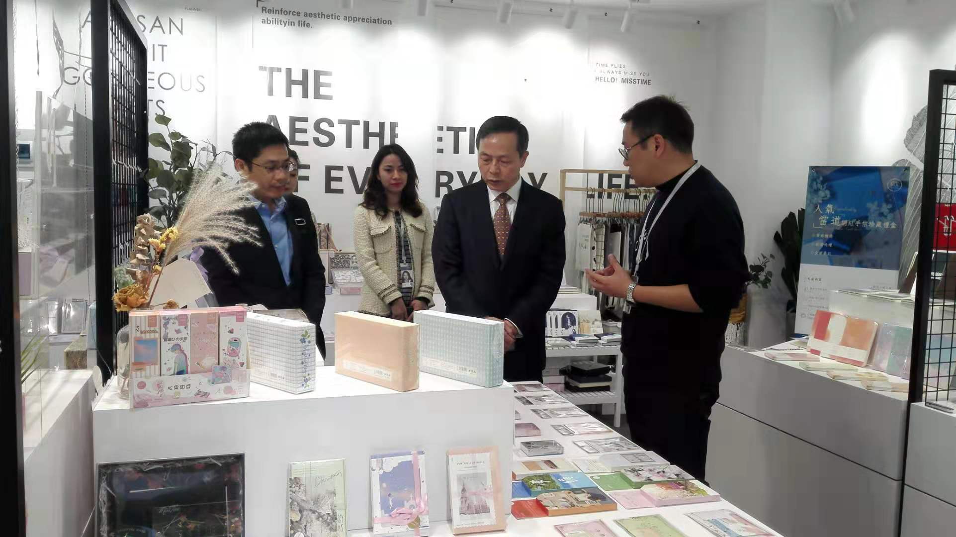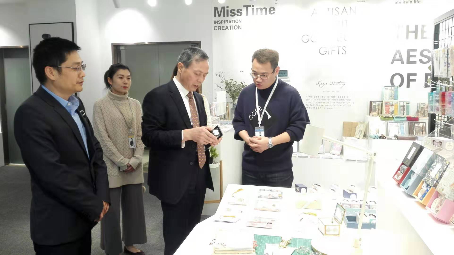 虞岳明一行先后考察了拾光艺创文创产品展示区、文创内容输出演示区和产品组、品牌组、插画组等员工工作区,并与拾光艺创核心团队进行座谈。在听取相关情况汇报后,虞岳明对拾光艺创工作给予充分肯定。一是拾光艺创团队年轻富有活力,协作精神好,危机意识强。二是善于运用头脑风暴,注重产品创意设计,注重提供增值服务,业务发展势头好。三是年轻党员多,企业文化很有特色。他指出,拾光艺创发展实践证明,集团公司大力培育工美文化主业,推进文化与旅游、创意、数字经济深度融合发展的路子是正确的。
